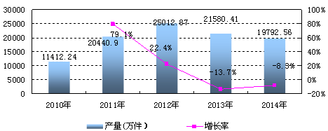 2012年中国液压元件产量为25012.87万件,同比上升22.4%,2013年中国液压元件产量为21580.41万件,同比下降13.7%,2014年中国液压元件产量为19792.56万件,同比增长8.3%。