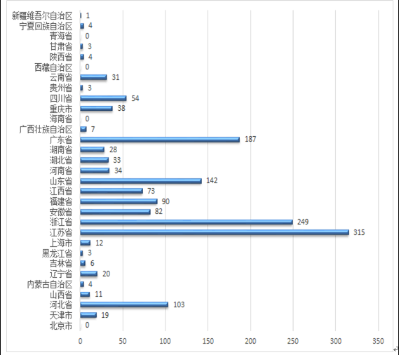 2016年,我国铅酸蓄电池产业获证企业数量1556家。行业企业主要分布在江苏、浙江、广东、河北等几个省市,如下图所示: