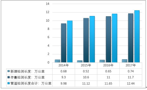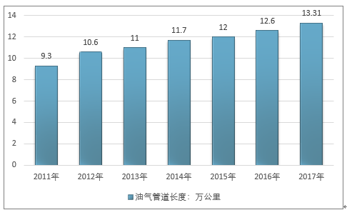 近年来,我国油气管道内检测技术逐渐成熟,国内外技术差距正在逐步缩小,国内提供管道内检测单位较多,主要有GE PII、ROSEN、中国石油天然气管道局管道技术公司及中国特种设备检测研究院等。我国油气管道长度增长快速,从2011年的9.3万公里,到2017年我国油气管道长度约13.31万公里。近几年我国油气管道长度情况如下表所示: