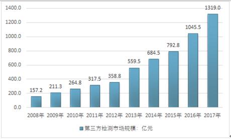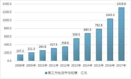2016年我国第三方检测市场规模为1045.5亿元,同比2015年的792.8亿元增长了31.9%,2017年我国第三方检测市场规模增长至1319.0亿元。近几年我国第三方检测市场规模情况如下图所示: