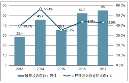 2017年共收到环保投诉128.1万件1,其中涉及噪声的投诉55.0万件(占比42.9 %),办结率为99.7 %。近五年噪声投诉情况如下图所示。