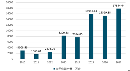 光学仪器是由单个或多个光学器件组合构成。主要分为两大类,一类是成实像的光学仪器;另一类是成虚像的光学仪器,如望远镜、显微镜、放大镜等。2010-2016年,我国光学仪器的产量波动较大,2014年国内光学仪器产量较2013年减少回落至7654.05万台,2015年随着国内经济好转的强势拉动,光学仪器产量大幅上涨;前瞻统计,2016年设备产量约为15329万量,在下游需求的推动下,2017年产量有望超过17800万台。