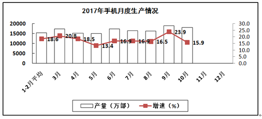 2017年1-10月,我国生产手机161917万部,同比增长5.3%,其中智能手机119799万部,同比增长3.6%,占全部手机产量比重为74.0%。