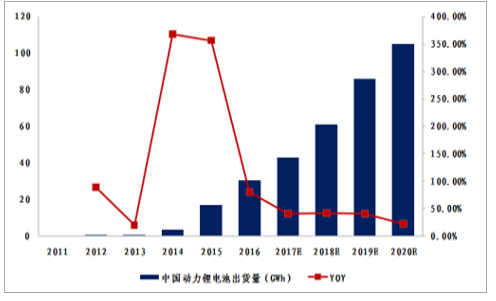 图表:2012-2017年中国动力锂电池行业工业总产值