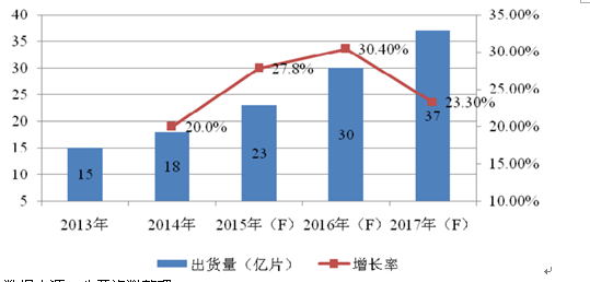 智能终端产品的普及带动触控屏产业规模快速增长,2014年全球触控屏出货量近18亿片,同比增长约20%。预计至2017年,全球触控屏产品出货量有望达到35-40亿片/年。