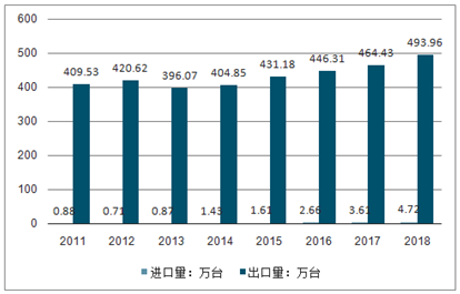 图表:2014-2019年中国燃气热水器产销量与出口量动态对比图