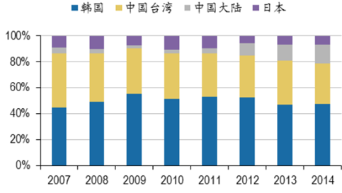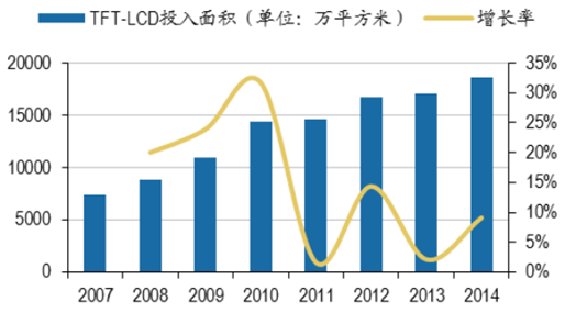 液晶显示 技术一直在不断发展。从大尺寸TFT-LCD面板来看,近年来投产面积加大,从2007 到2014年,投产面积从7,346万平方米提升至18,647万平方米,增长154%。目前, 平板显示行业生产基地主要集中在日本、韩国、中国台湾、中国大陆,形成“三国 四地”的产业模式。中国大陆由于具有资金和政策优势,有实力耗巨资建设高世代 生产线,在以需求为导向的平板显示行业的投产博弈中处于有利位置,更加吸引产 业向中国大陆布局。
