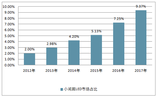 2012年小间距LED市场占比从2%上升到2017年的9.37%,重要性显著增强,2018年后有望提升至10%以上的份额。
