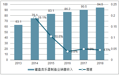 2013-2019年中国键盘类乐器制造行业销售收入增长