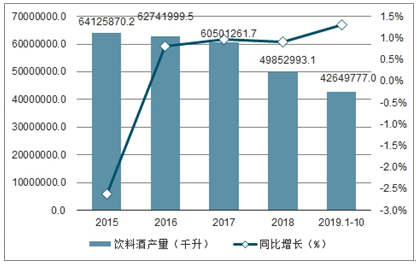 2015-2019年1-10月中国饮料酒产量及增速趋势图