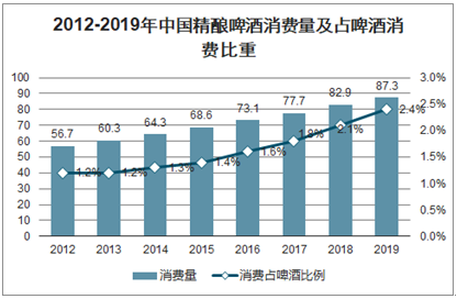 2012-2019年中国精酿啤酒消费量及占啤酒消费比重