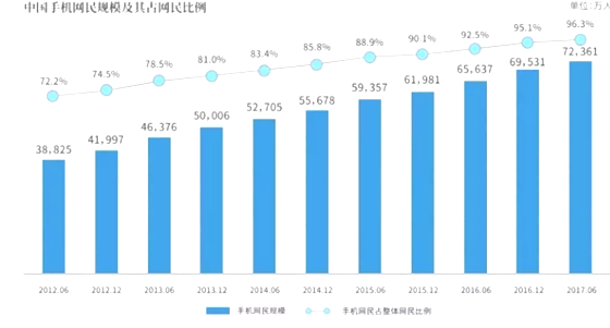 截至2017年6月,我国手机网民规模达7.24亿,较2016年底增加2830万人。网民使用手机上网的比例由2016年底的95.1%提升至96.3%。