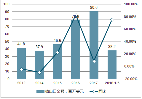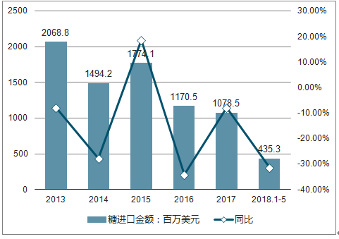 2018年1-5月,我国食糖进口金额为435.3百万美元,同比下滑31.2%。2013-2017年我国食糖进口金额在2017年最低为1078.5百万美元,同比下滑7.9%;2013年为最高值达2068.8百万美元,同比下滑7.8%。