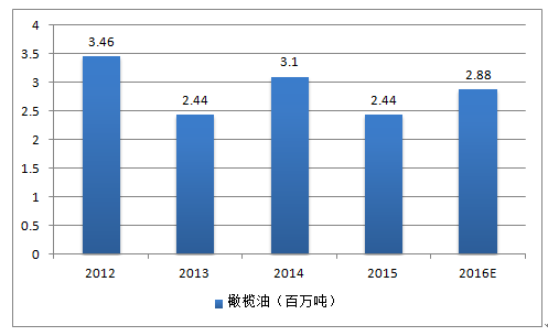 2015年全球橄榄油产量为2.44百万吨,预计2016年全球橄榄油产量为2.88百万吨;