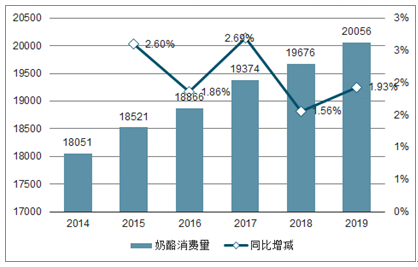 图表:2015-2019年中国奶酪行业产量走势图(单位:万吨)