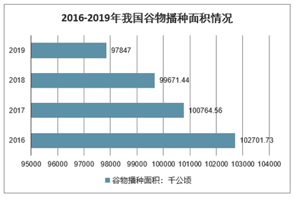 随着农业供给侧结构性改革,2019年,全国谷物播种面积97847千公顷,同比下降1.8%。