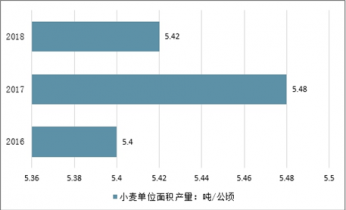 2009~2017年中国小麦单位面积产量实现了连续8年增长,其中2017 年平均产量为5.48吨/公顷,2018年下降至5.42吨/公顷。小麦产量的年际增幅变化较大,小麦单产逐年增幅比例由高速增长阶段转为低速增长阶段。