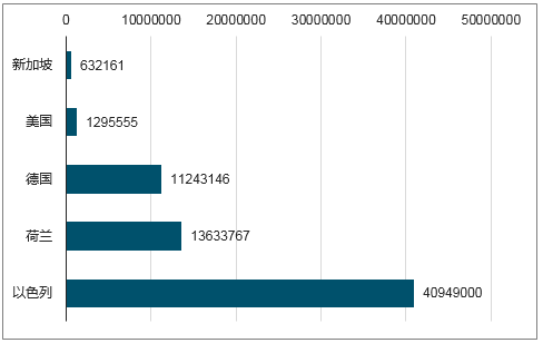2013-2017年间,以色列是全球最大的四氢大麻酚(所有的异构体)(HS:293295)出口国,出口总额达4094.9万美元,排在第二位的是荷兰,出口总额为1363.38万美元,德国、美国、新加坡出口总额依次为1124.31万美元、129.56万美元、63.22万美元。