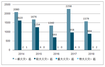 2019年,全国共发生森林火灾2478起,同比2017年3223起下降23.11%,其中:一般森林火灾1579起、较大森林火灾894起、重大森林火灾3起、特大森林火灾2起。