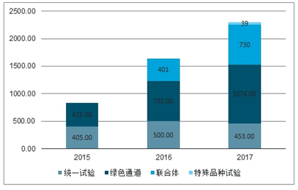2015-2017年水稻各渠道参试品种数量