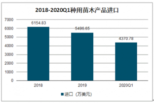 2018-2019年中国种用苗木行业进口金额呈下降趋势,2019年种用苗木行业进口金额为5496.65万美元,同比下降10.69%。2020年1-3月中国种用苗木产品进口金额为4370.78万美元。表明我国国内生产逐渐能够满足种用苗木需求。