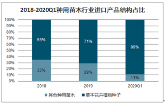 相对于其他种用苗木,草本花卉植物种子进口金额较大,2018-2020年草本花卉植物种子进口比重加大,2019年草本花卉植物种子进口比重达到71%,同比上升6个百分点;2020年第一季度,草本花卉植物种子进口比重达到89%。