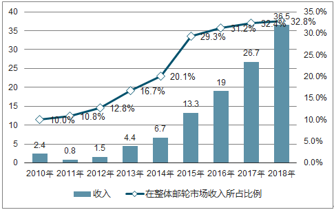 2010-2018年中国在线邮轮市场收入规模及所占比例