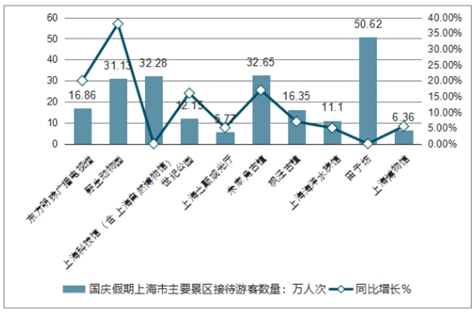 2019年国庆假期上海市主要景区接待游客数量及同比增长走势