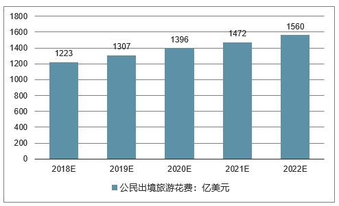 预计,2019年中国公民出境旅游花费将达到1223亿美元,未来五年(2018-2022)年均复合增长率约为6.27%,2022年中国公民出境旅游花费将达到1560亿美元。
