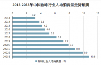 随着互联网快速普及及外卖配送业务快速发展,咖啡营销方式由传统线下门店向线上营销转移,以连咖啡和瑞幸咖啡为代表的咖啡新零售商,利用互联网营销效应,开始抢占中国中端咖啡市场,有效降低咖啡文化门槛,提高咖啡宣传效应,进一步扩大受众群体。2018年中国咖啡市场规模569亿元。2019年我国咖啡市场消费规模估计突破700亿元,人均咖啡消费量达7.2杯;到2023年中国人均咖啡消费量10.8杯,咖啡市场规模1806亿元。