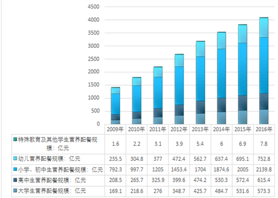 目前,我国学生营养配餐市场主要分为大学生营养配餐、高中生营养配餐、小学、初中生营养配餐、幼儿营养配餐和特殊教育及其他学生营养配餐。