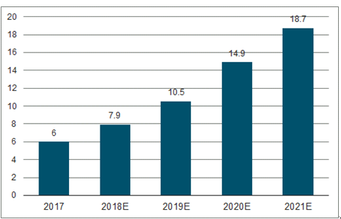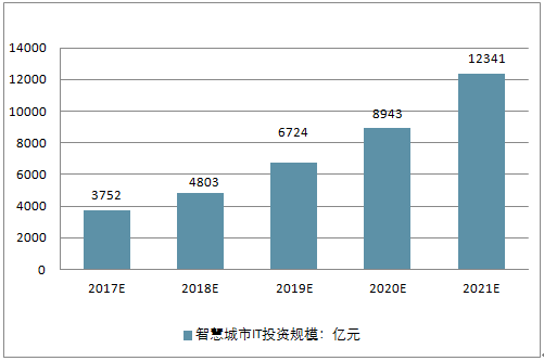 2017年我国智慧城市IT投资规模将达到3,752亿元,未来五年(2017-2021)年均复合增长率约为31.12%,2021年IT投资规模将达到12,341亿元。