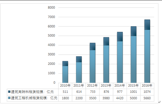 2016年我国建筑器材租赁行业总体市场规模约6734亿元,其中建筑工程机械租赁规模约5660亿元,建筑周转料租赁规模1074亿元。如下图所示: