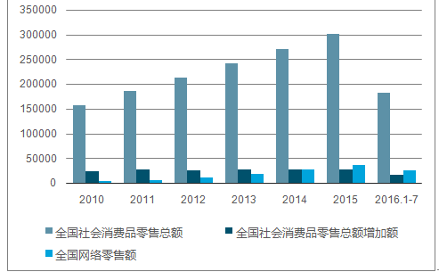 2010-2016年7月全国社会消费品零售总额与网络零售额