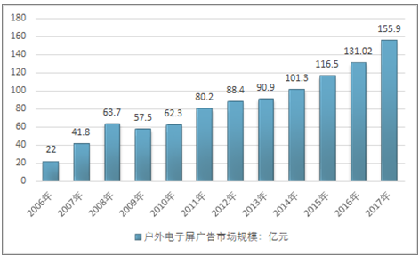 2015年我国户外电子屏广告市场规模约116.5亿元,同比2014年的101.3亿元增长了15%,2016年我国户外电子屏广告市场规模达到131.02亿元。2017年我国户外电子屏广告市场规模达到了155.9亿元。近几年我国户外电子屏广告市场规模情况如下图所示: