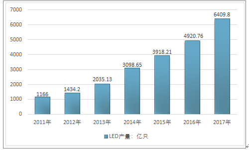 2017年,全国发光二极管(LED)继续保持高速增长,完成累计产量6409.8亿只。广东省是发光二极管(LED)目前全国最大的产区,占全国总产量的69%以上,其次依次是福建、江苏、浙江、安徽。