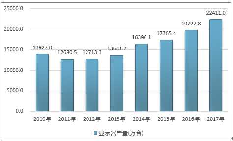 2015年我国显示屏产量为17480万台,较2014年的16396万台增长6.61%。初步统计2017年我国显示器产量为22411万台。