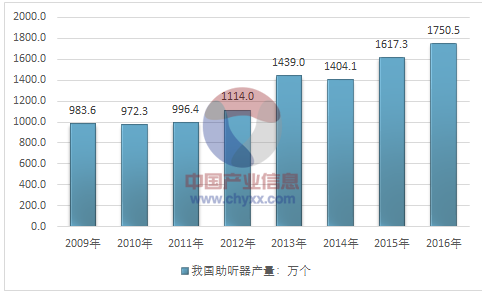 目前中国是全球最大的助听器产品生产国,2009年我国助听器行业总产量为983.6万个,到2016年行业总产量增长至1750.5万个。