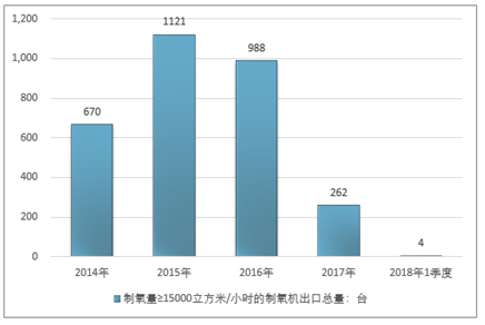 2016年我国制氧量≥15000立方米/小时的制氧机出口总量988台,2017年出口总量262台;2019年1季度出口总量4台。