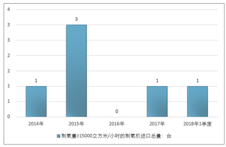 2016年我国制氧量≥15000立方米/小时的制氧机进口总量-台,2017年进口总量1台;2019年1季度进口总量1台。