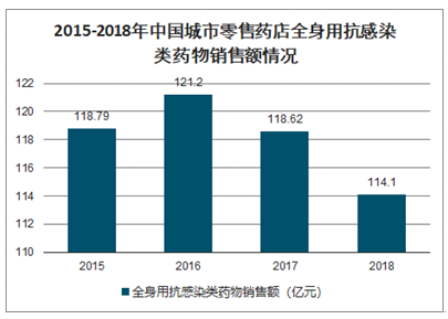 2015-2018年中国城市零售药店全身用抗感染类药物销售额情况