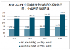 2015-2018年中国城市零售药店消化系统化学药、中成药销售额情况