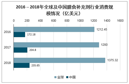 2016-2018年全球及中国膳食补充剂行业消费规模情况