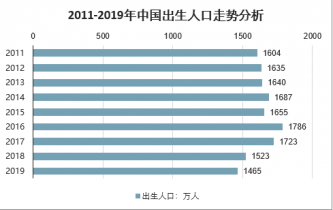 2010-2016年我国每年出生人口从1592 万增长到1786 万,特别是受2013 年11 月起实施“单独二孩”政策的影响,2014 年出生人口数量较2013 年增长47 万人,人口出生率提高2.87 个百分点,2016年全面二胎放开以来,国内新生人口数激增,较2015年度增加131万人。2018年全年出生人口1523万人。2019年全年出生人口1465万人,人口出生率为10.48‰;