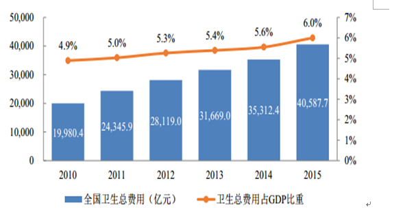 近年来,随着国民经济的发展,我国居民可支配收入水平持续上升,公众的健康意识也在不断增强, 使得我国居民对医疗服务的消费能力和消费需求得到了有效提升。另一方面,我国的城镇职工医疗保险制度、城镇居民医疗保险制度和新型农村合作医疗保险制度相继建立并不断完善, 大大提升了患者及其家属对医疗费用的支付能力。受此推动,我国医疗服务需求持续增长,医疗服务市场规模不断扩大,根据政府有关部门的规划目标,在未来仍将保持持续较快的增长。我国包括政府卫生支出、社会卫生支出及个人卫生支出在内的卫生总费用由 2010 年的 19,980.4 亿元增至 2015 年的 40,587.7 亿元,年均复合增长率为 15.2%。卫生总费用占我国 GDP 的比重也不断提升,从 2010 年的 4.9%增长至 2015 年的 6.0%。卫生部组织研究发布的《“健康中国 2020”战略研究报告》提出“到 2020 年,主要健康指标基本达到中等发达国家水平”,其包括的 10 个具体目标之一即为到 2020 年,卫生总费用占 GDP 的比重达到 6.5%-7.0%,未来我国医疗卫生支出在国民经济中的重要性将得到进一步提升。近年来我国卫生总费用及其占 GDP比重情况如下图所示: