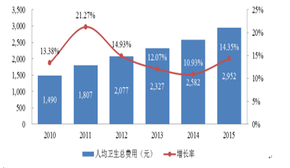 与此同时,我国人均卫生总费用水平近年来也始终保持两位数的增速,从2010 年的 1,490 元增长至 2015 年的 2,952 元,年均复合增长率达到 14.7%。近年来我国人均卫生总费用及其增长情况如下图所示: