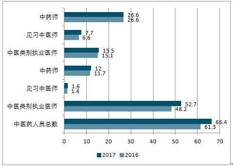 2017年末,全国中医药卫生人员总数达66.4万人,比上年增加5.1万人(增长8.3%)。其中:中医类别执业(助理)医师52.7万人,中药师(士)12.0万人。两类人员较上年有所增加。