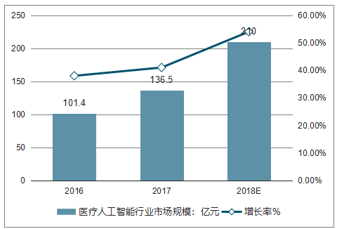 2018年中国医疗人工智能行业市场规模达到136.5亿元,增长率为41%;医疗人工智能应用的不断深入,市场规模将进一步增长,预计2018年市场规模有望突破200亿元。