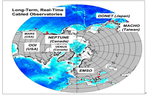 目前世界上已经初步建成或在建的较大规模观测网主要有:欧洲ESONET/EMSO、美国OOI、加拿大ONC(由VENUS与NEPTUNE组成)、日本DONET、及我国台湾MACHO等。其中,前三个项目用于海洋探索及多学科研究,DONET及MACHO项目则主要用以地震监测和海啸预警。
