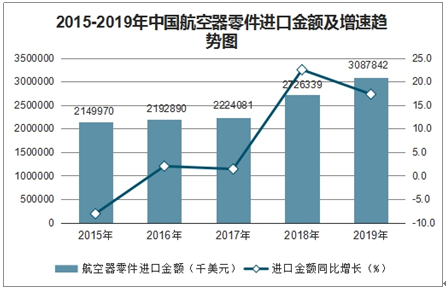 2015-2019年中国航空器零件进口金额及增速趋势图
